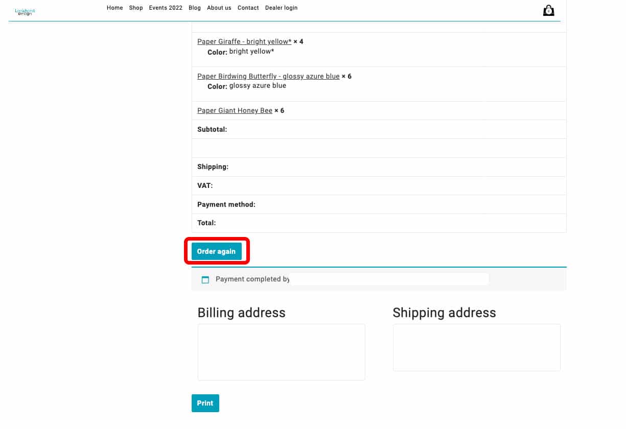 - Scroll down and click the button ‘Order again’, this will bring you to a new page where you can edit the new order.