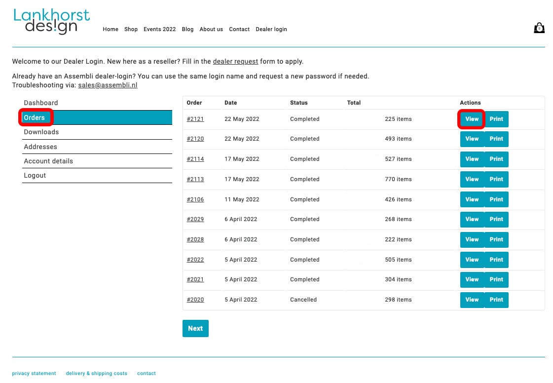 - Click on the ‘Orders’ button in the left menu. You will now see all your previously placed orders. Then click on the ‘View’ button of your chosen order.