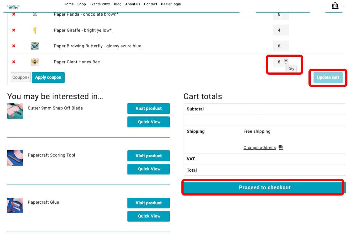 - Change the products and quantity if you like and click ‘Update cart’, then click ‘Proceed to checkout’ to replace your new order.