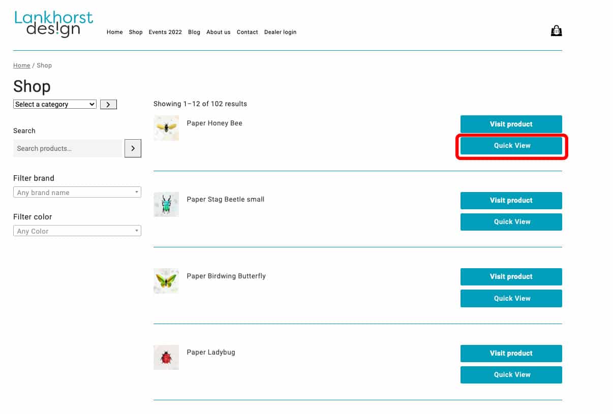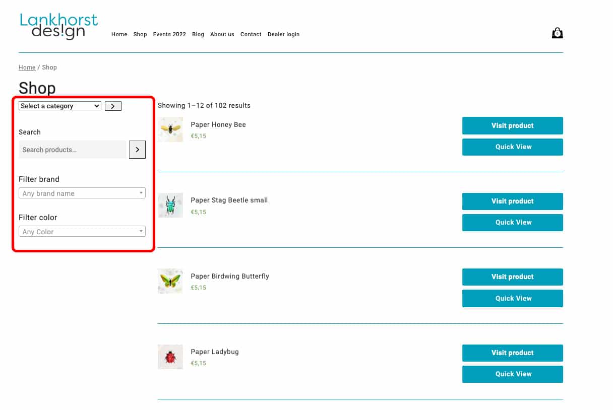 - Go to the ‘Shop‘ menu and filter the products by brand, category, color or by a word in the search bar.