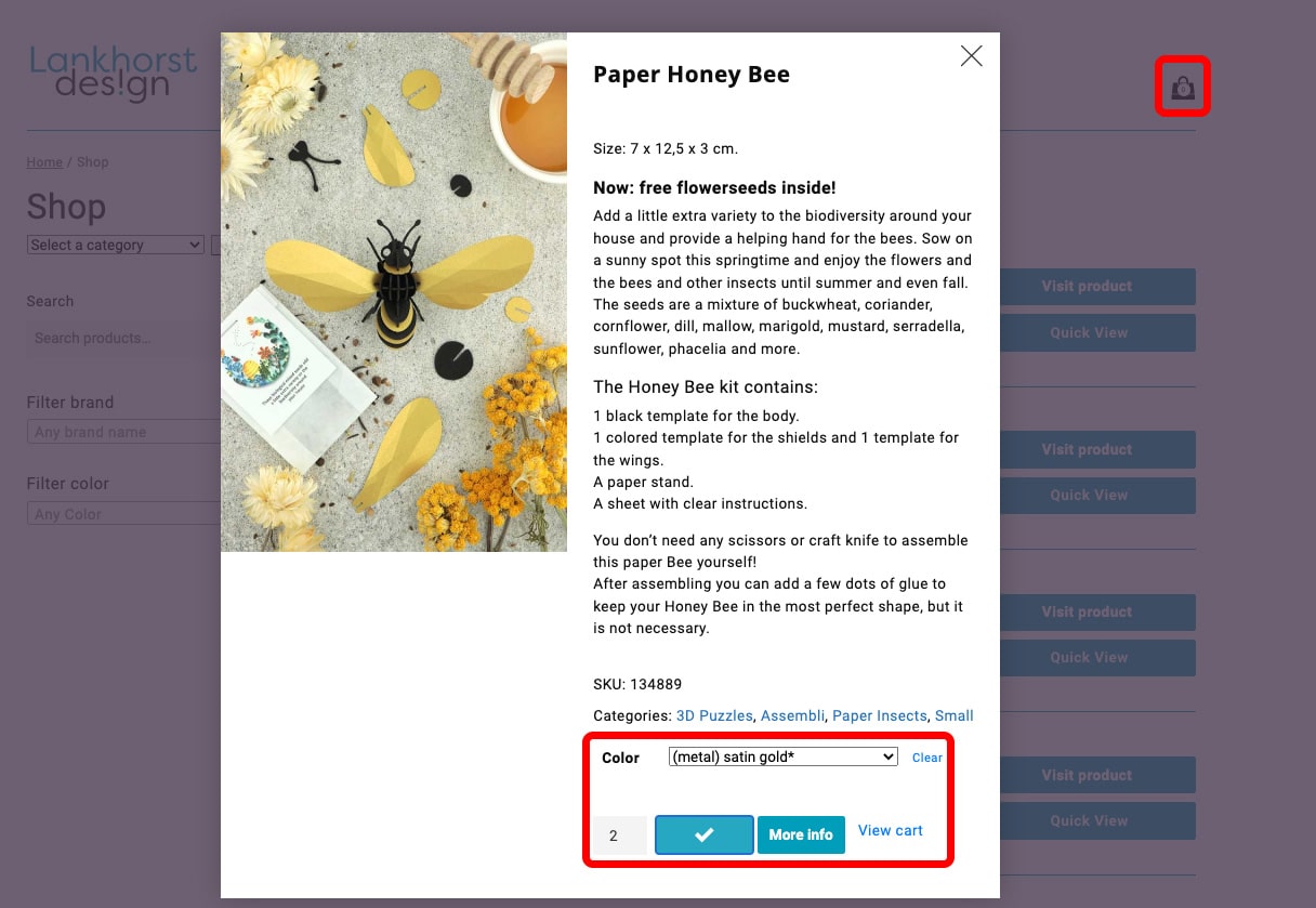 - Select a color or size and the quantity in the pop up screen and then click the blue ‘Add to cart’ button. Then click ‘View cart‘ or the shopping bag logo in the right top menu and you will find you chosen products.